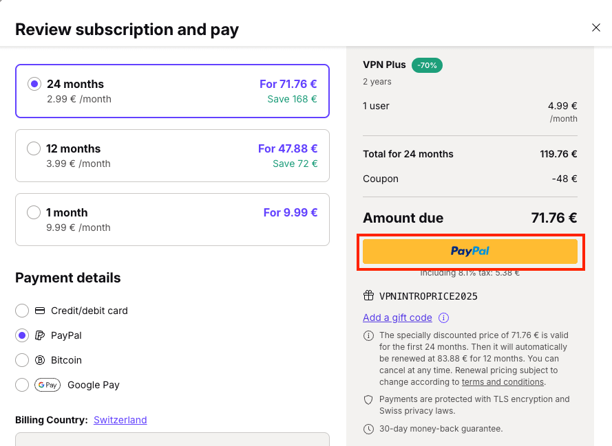 If you’re new to Proton or want to use a different card, you can register a new one. Enter your card details, review your payment, and click the Pay now button.